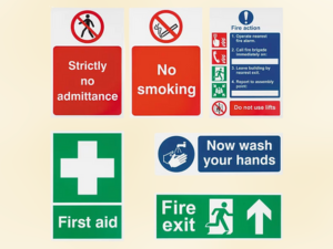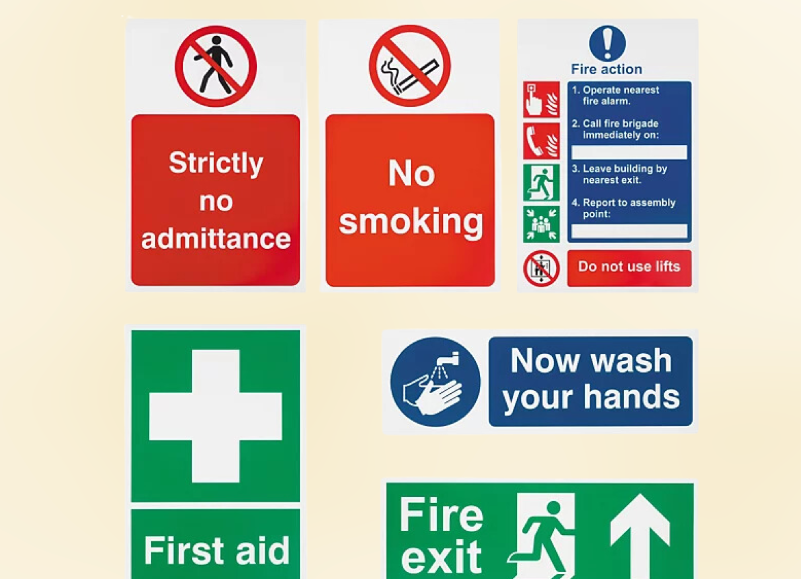 Industrial safety signboard with warning symbols used at construction or factory sites in the UAE